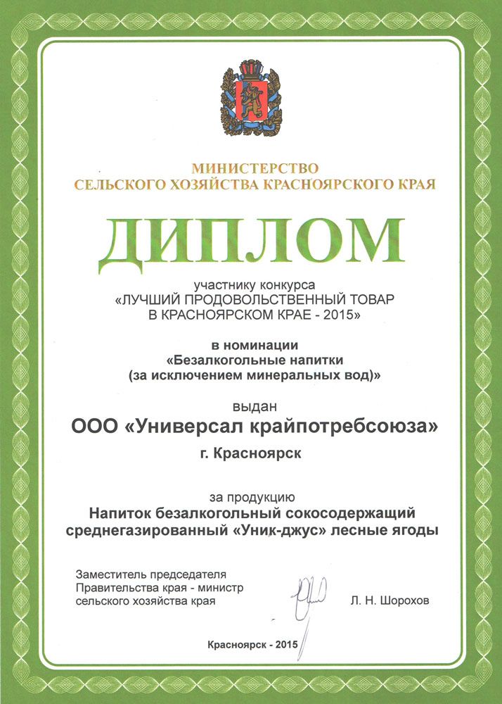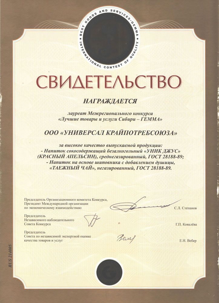 ООО «Универсал Крайпотребсоюза» производит безалкогольную продукцию: питьевая и газированные сокосодержащие и низкокалорийные напитки под СТМ, питьевая и питьевая газированная вода под ТМ «Сибирская», производит низкокалорийные напитки, квасные напитки, сокосодержащие напитки.